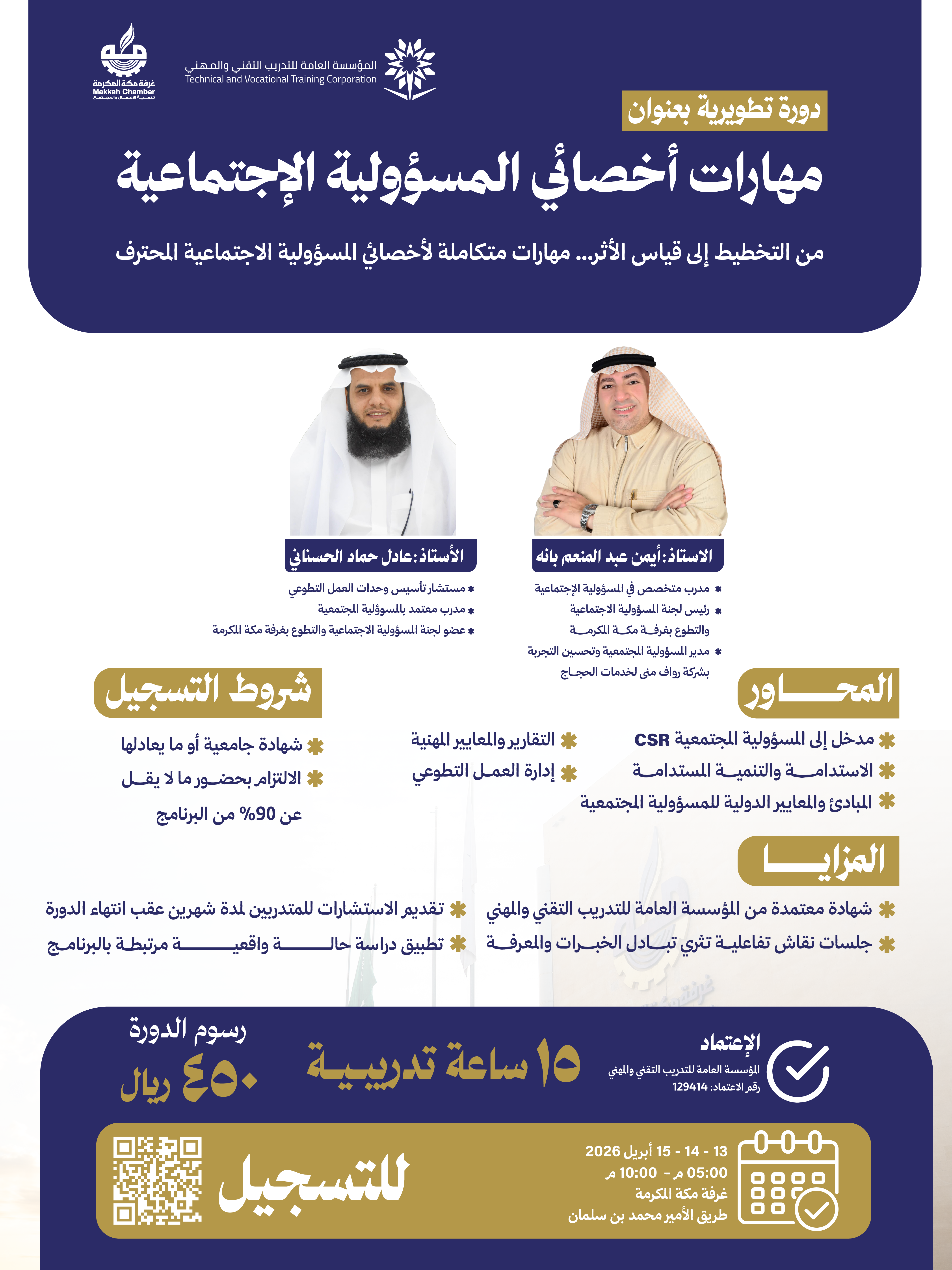 المحاور/ 1/ مدخل إلى المسؤولية المجتمعية (CSR). 2/ المبادئ والمعايير الدولية للمسؤولية المجتمعية. 3/ الاستدامة والتنمية المستدامة. 4/ التقارير والمعايير المهنية. 5/ إدارة العمل التطوعي.