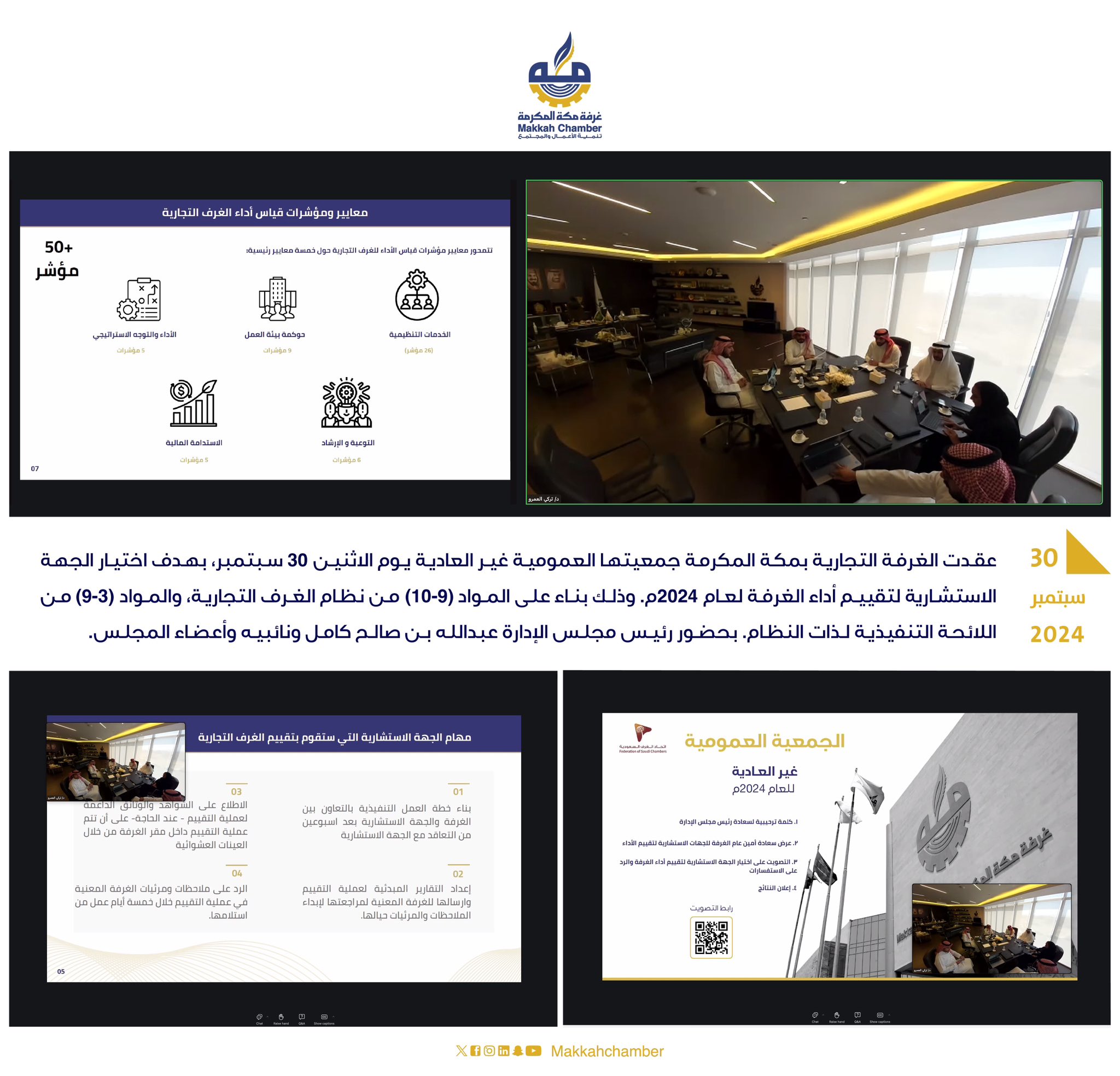 عقدت #غرفة_مكة المكرمة جمعيتها العمومية غير العادية يوم الاثنين 30 سبتمبر، بهدف اختيار الجهة الاستشارية لتقييم أداء الغرفة لعام 2024م. وذلك بناء على المواد (9-10) من نظام الغرف التجارية، والمواد (3-9) من اللائحة التنفيذية لذات النظام. بحضور رئيس مجلس الإدارة عبدالله بن صالح كامل ونائبيه وأعضاء المجلس. وبحسب نتيجة التصويت وقع الاختيارعلى مكتب عاصم طاهر عرب للاستشارات المهنية بعد حصوله على نسبة 93.97%